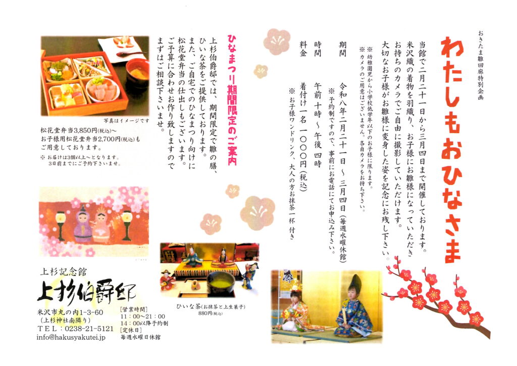 Children can wear beautiful Yonezawa-ori silk kimono and transform into traditional hina dolls. You are welcome to take commemorative photos freely using your own camera.